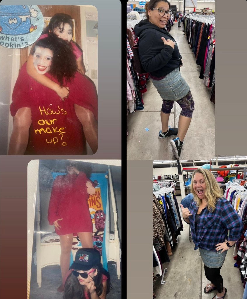 By the looks of my pictures on a recent night out with my friend Cherie….Not much has changed. We went thrift shopping just to see what treasures we would find. In the process, we decided to try on some skirts. We both decided why the heck not, so we put them on over our leggings, Ha! Yep we took it back to an era when we were carefree….80’s for life! Denim mini’s = Electric Youth😆~So Nostalgic. Who needs a dressing room🤷🏽♀️ We laughed so hard as we tried on a multitude of tops, bottoms and dresses, so hard we were in tears. Society has us believing that once we hit “adulthood” that we need to carry ourselves a certain way. Isn’t it better to to carry yourself as yourself and truly just be YOU?!